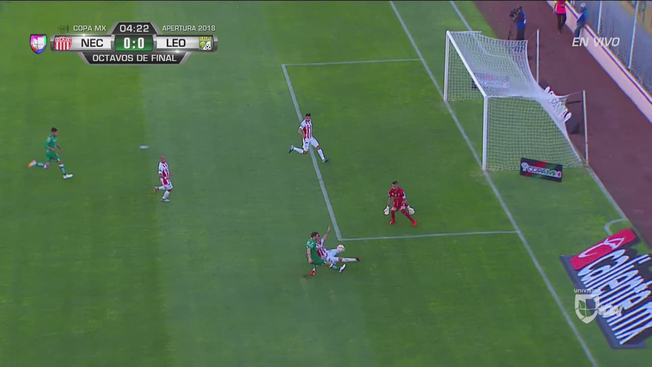 El delantero argentino de León por poco anota el primer gol del juego luego de un error de la defensa de Necaxa. Por suerte para los locales, Ventura Alvarado salvó en última instancia.