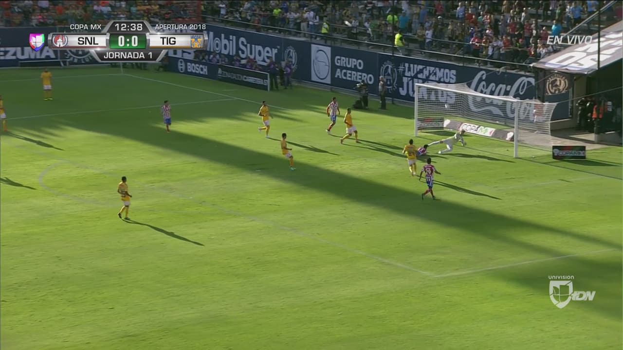 El portero de Tigres tuvo que lanzarse con un manotazo para evitar el primer gol en el Alfonso Lastras. El Atlético San Luis está encima de la cabaña de los felinos y Pineda casi marca con el pecho.