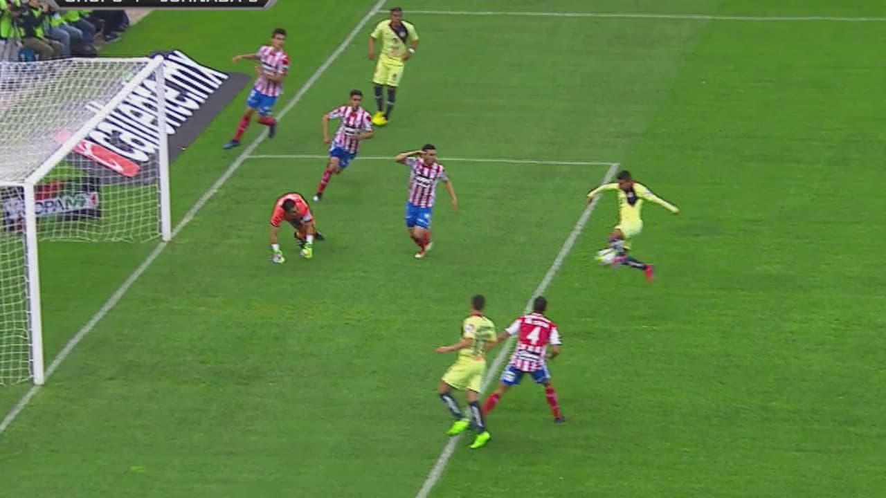 El arquero del Atlético San Luis Felipe Rodríguez, rechazó el disparo de Roger Martínez y Jesús López se la perdió solo frente al arco.
