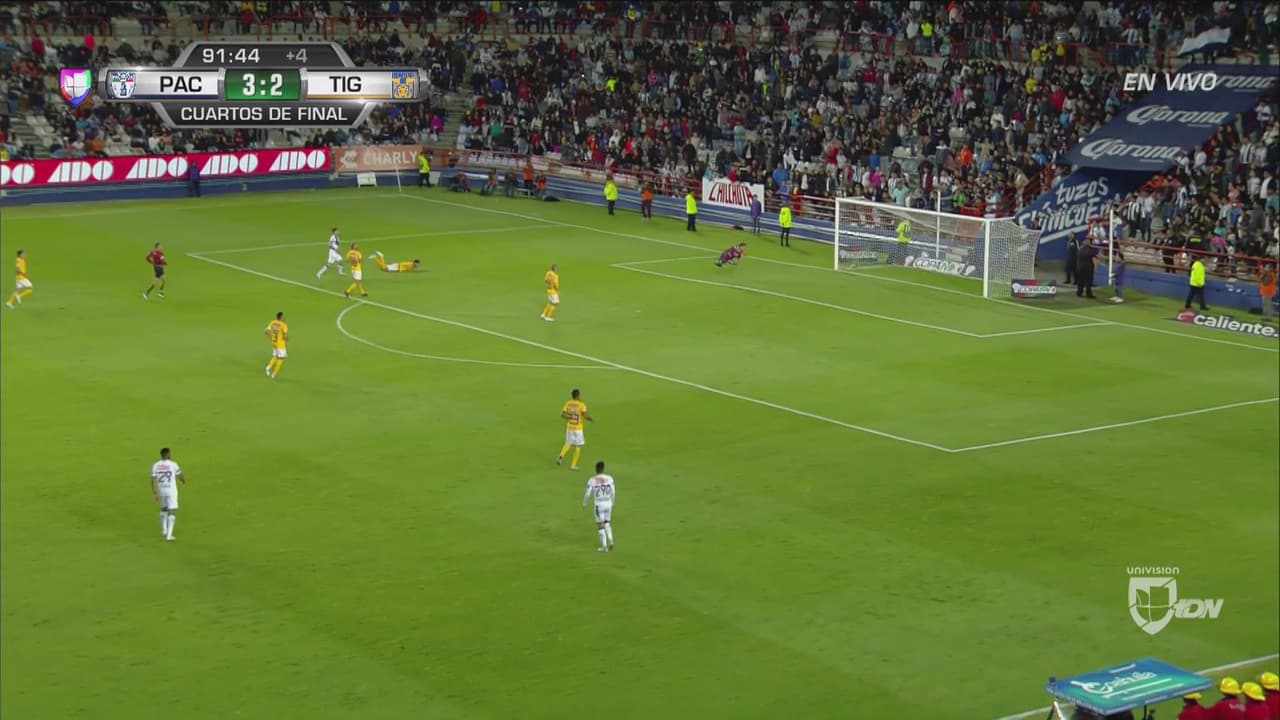 El chileno se animó a rematar con la zurda y sacó una metralla que se estrelló en el travesaño. Tigres se salvó del cuarto en el tiempo de compensación.