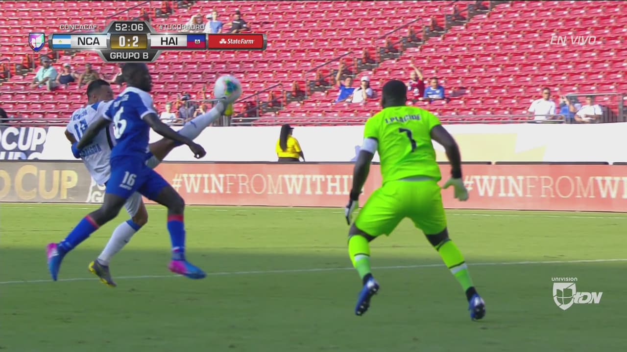 Luego de una desatención defensiva en la última línea de Haití, el combinado nicaraguense estuvo cerca de anotar su primer gol de la copa con un toque elevado.