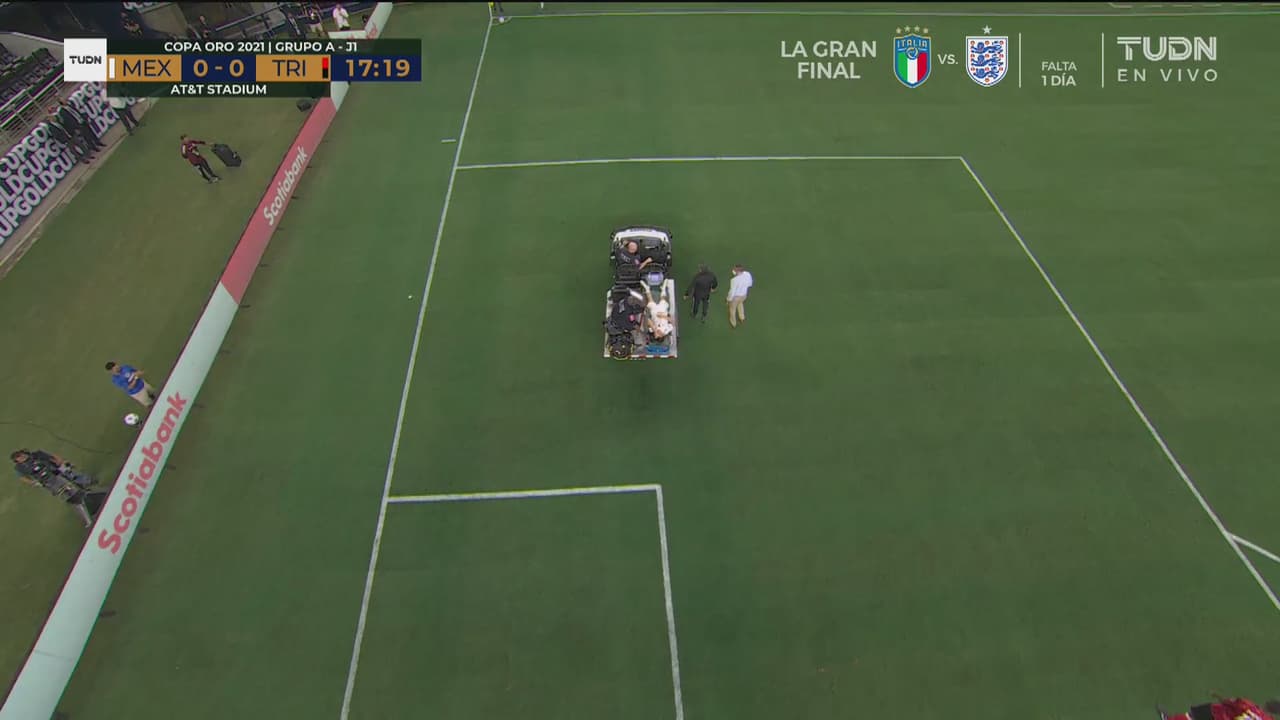 El mexicano es derribado en el área, le ponen collarín y ahora es trasladado en ambulancia.