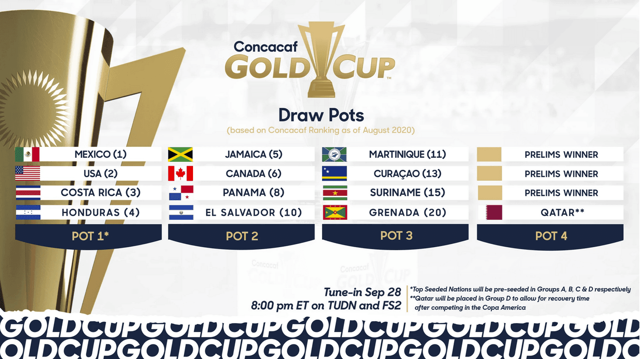Los cuatro equipos mejor clasificados (Bombo 1), según el ranking de Concacaf, serán cabezas de serie. Los actuales campeones de la Copa Oro y la nación mejor clasificada, México, estará en el Grupo A, Estados Unidos en el Grupo B, Costa Rica en el Grupo C y Honduras en el Grupo D.