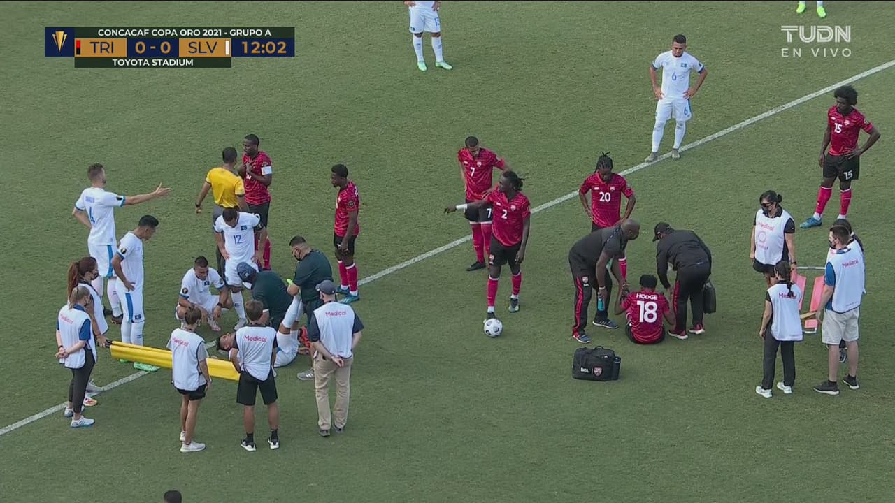 Al minuto 10 ambas selecciones pasaron un tremendo susto cuando el jugador trinitario Tristan Hodge y Bryan Tamacas chocaron con las cabezas y ambos quedaron tenidos varios miinutos en el césped.