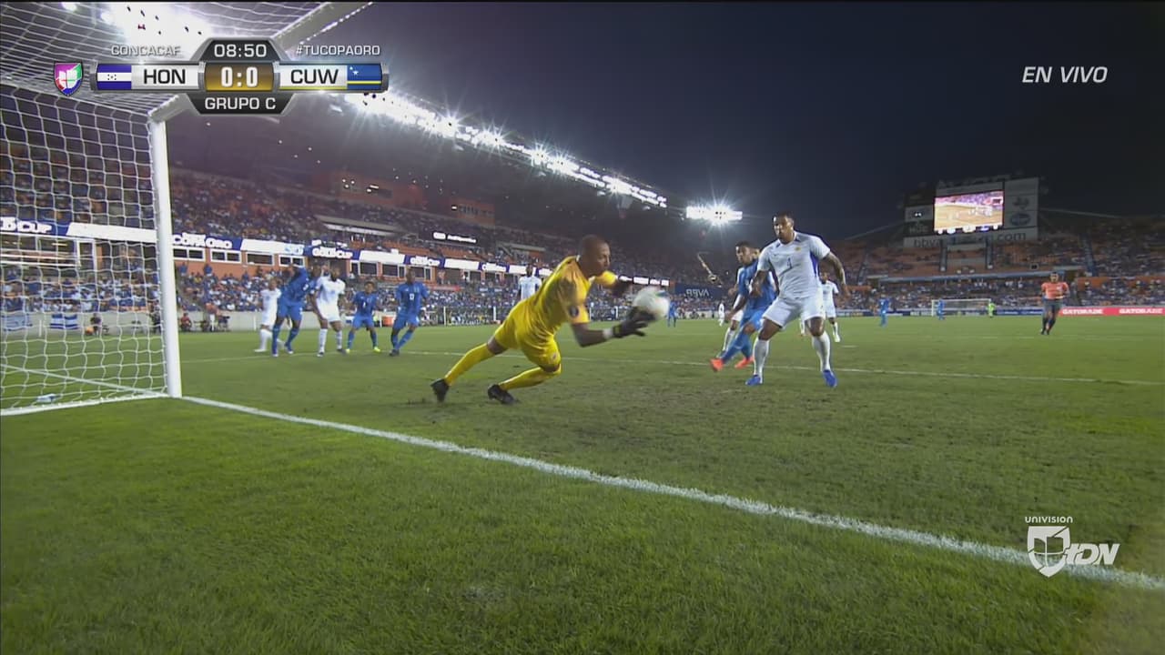 El arquero de Curazao quiere llevarse el show de la noche. Esta vez le detuvo de bote pronto para evitar el 1-0 de Honduras.