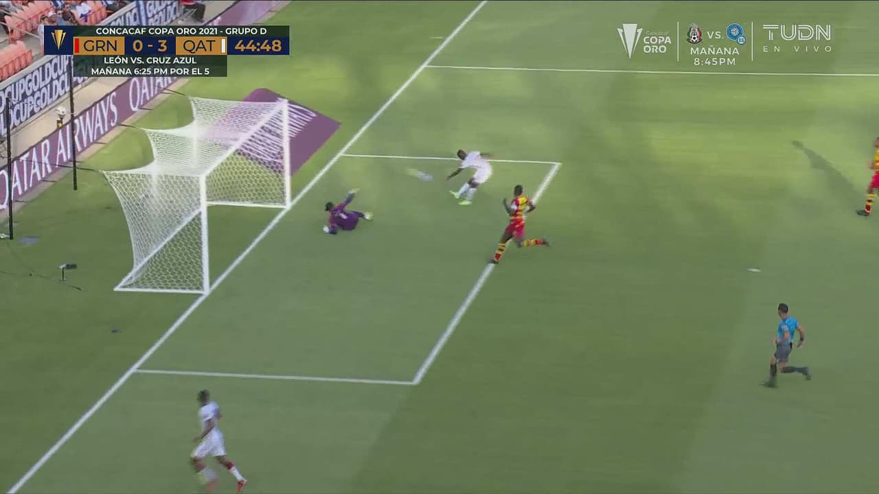 Con el portero en el piso y el arco a disposición, el jugador de Qatar desvía lo que era el 0-4 al 45'.