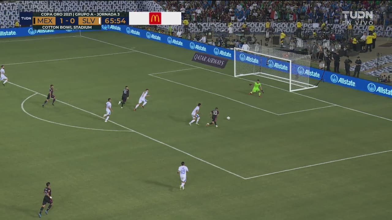 El ‘10’ del Tri se alargó el control y el arquero de El Salvador salió para desviar de último momento.