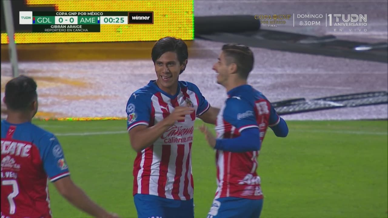 Pasaron 19 segundos para que Chivas tomara el mando del partido con una jugada de Alexis Vega por derecha, hizo una pausa en la conducción para esperar la ruptura de Macías y puso el pase justo para habilitarlo y que el delantero cruzara la pelota con atingencia.