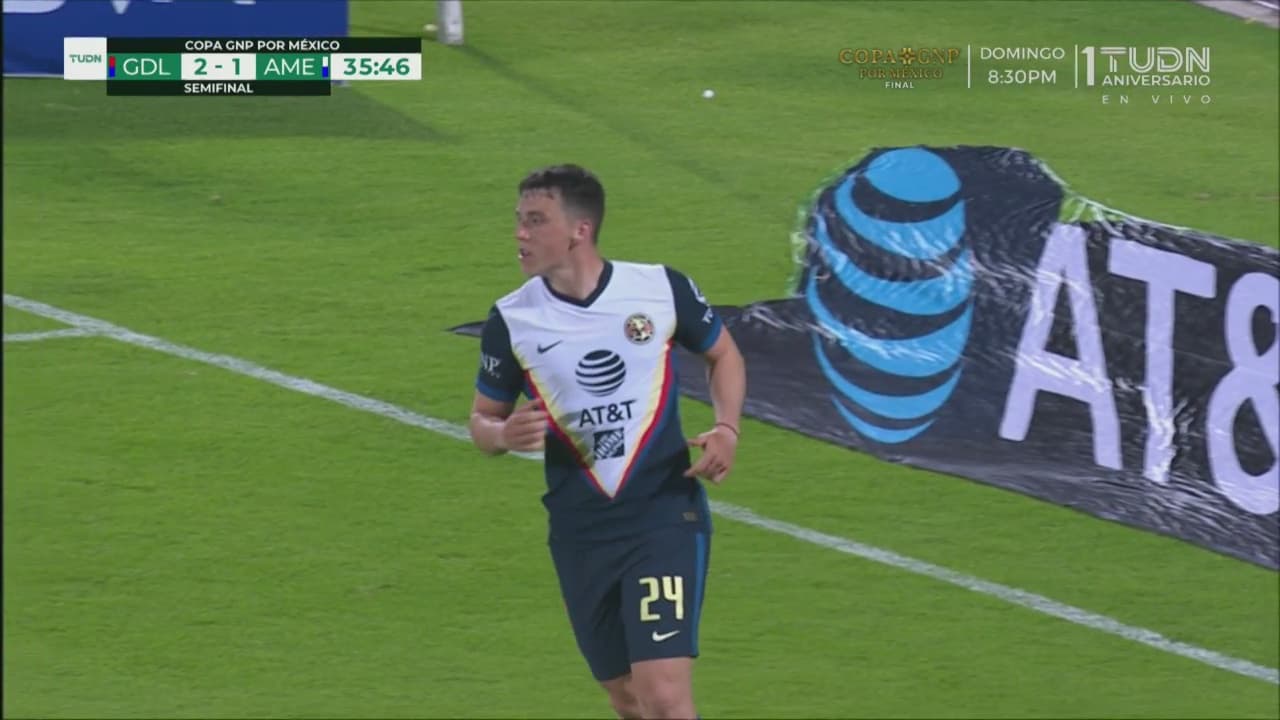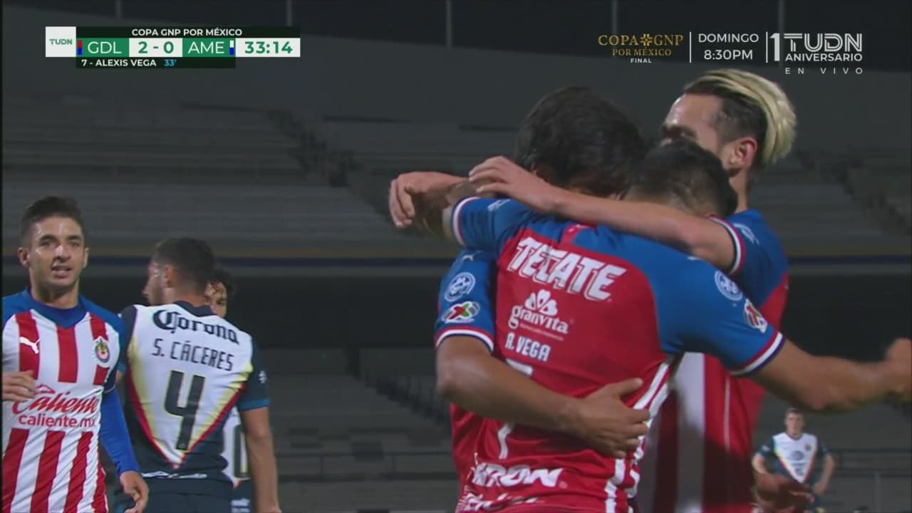 El Guadalajara no cesó en su afán de hacer pedazos al América y tejieron una jugada digna de grandes equipos, cuando un trazo a la banda llegó a los pies de Angulo, proyectó el balón al área para que Vega y José Juan Macías hicieran una pared perfecta que Alexis terminó con disparo potente al ángulo. El Rebaño jugaba por nota.