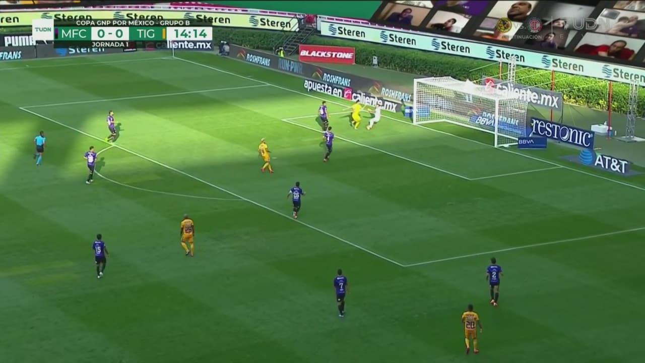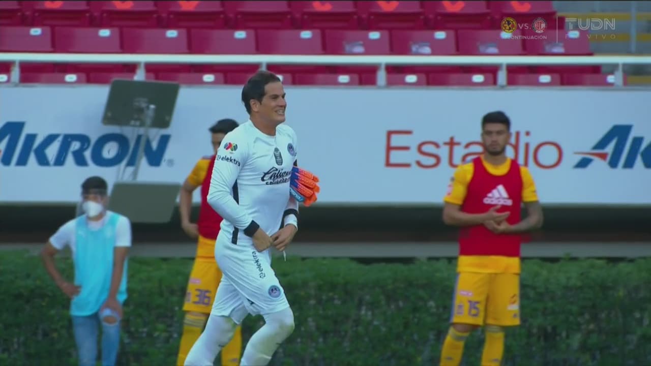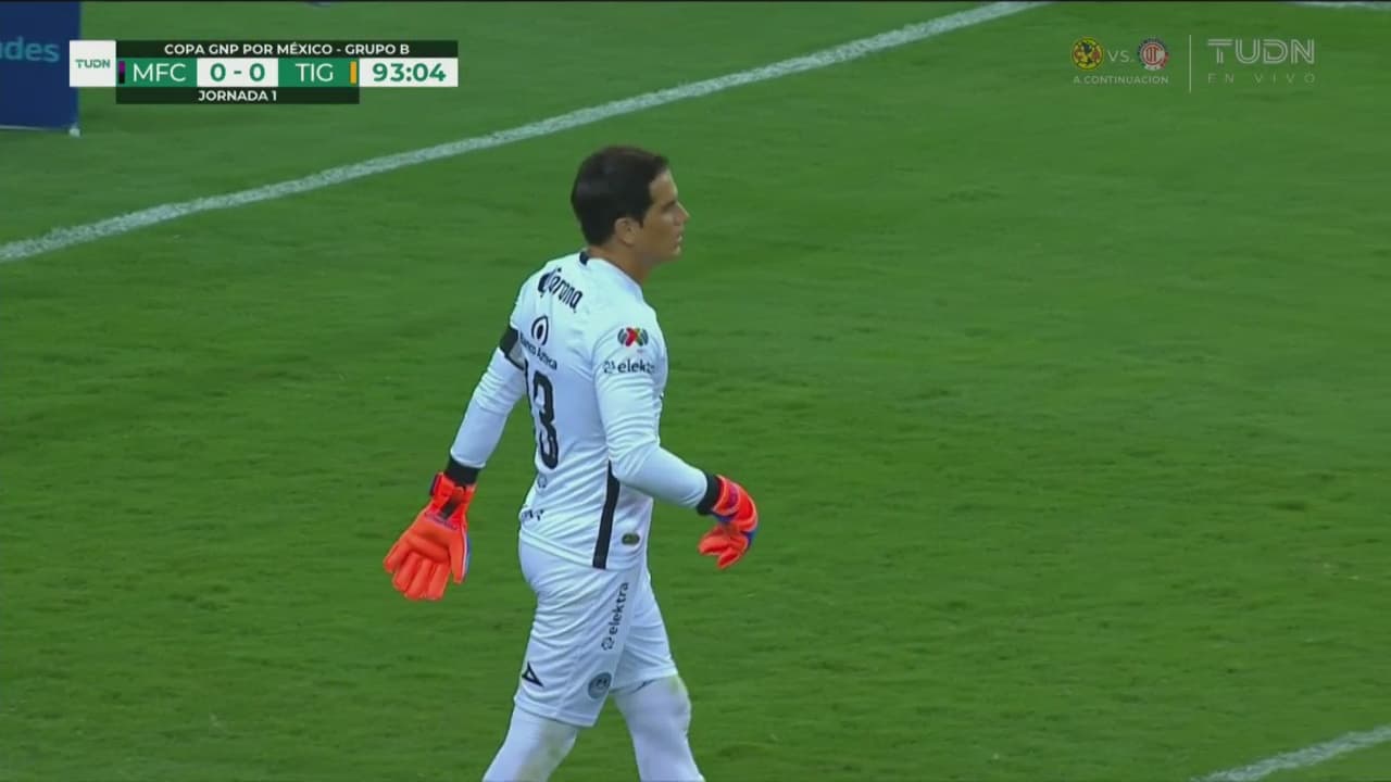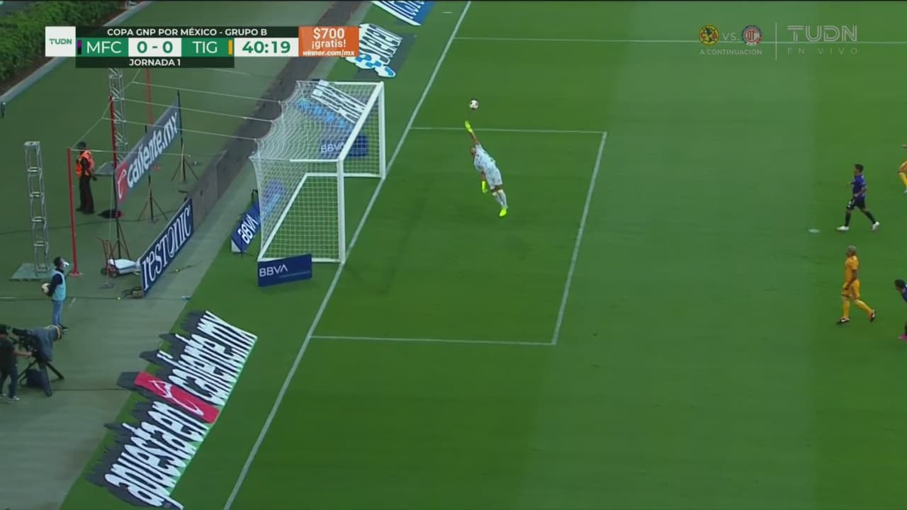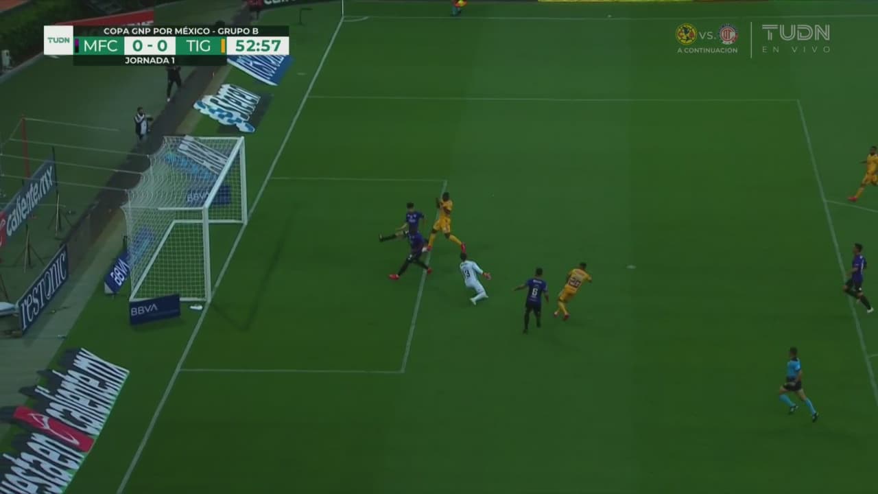 Una buena triangulación en el club del Pacífico culminó con una 'cuchara' del ‘Quick’ Mendoza, quien ya se saboreaba el gol, pero Nahuel Guzmán apareció y alcanzó a meter las manos para que el esférico pegara en el larguero al minuto 40.