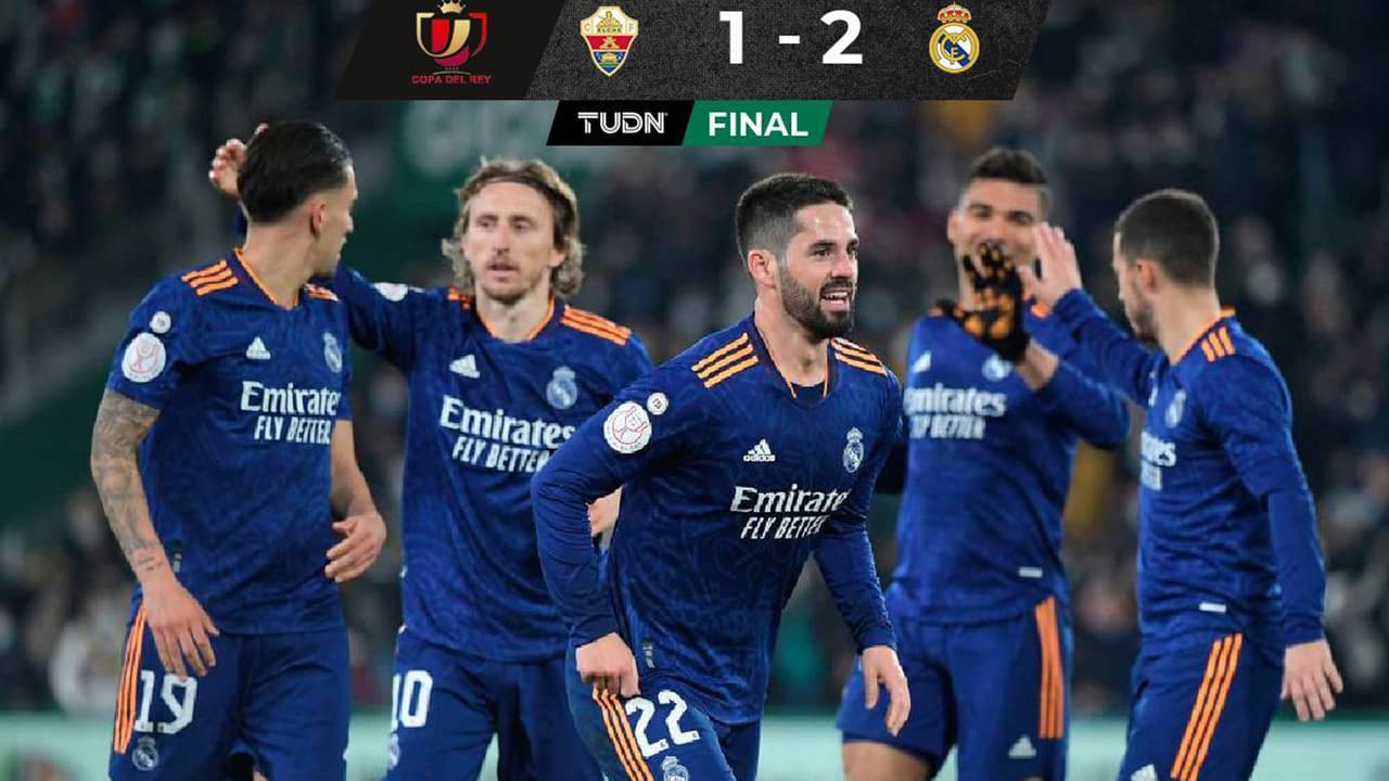 Un gol de Eden Hazard culminó en el minuto 115 la remontada de un Real Madrid en inferioridad numérica en la segunda parte de la prórroga de los octavos de final de la Copa del Rey, después de que en el primer acto del tiempo extra fuera expulsado Marcelo y se adelantara el Elche con un tanto de Gonzalo Verdú, que posteriormente neutralizó Isco.