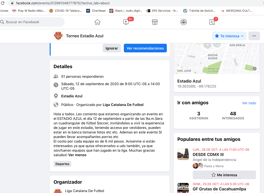 Sin embargo, se dice que los organizadores que rentaron el Estadio Azul formaron parte de la Liga Catalana de Futbol, que en su cuenta de Facebook, contrario a la información que circuló este martes, reveló que la renta fue de seis mil pesos, sin detallar algún tipo de paquete opcional.