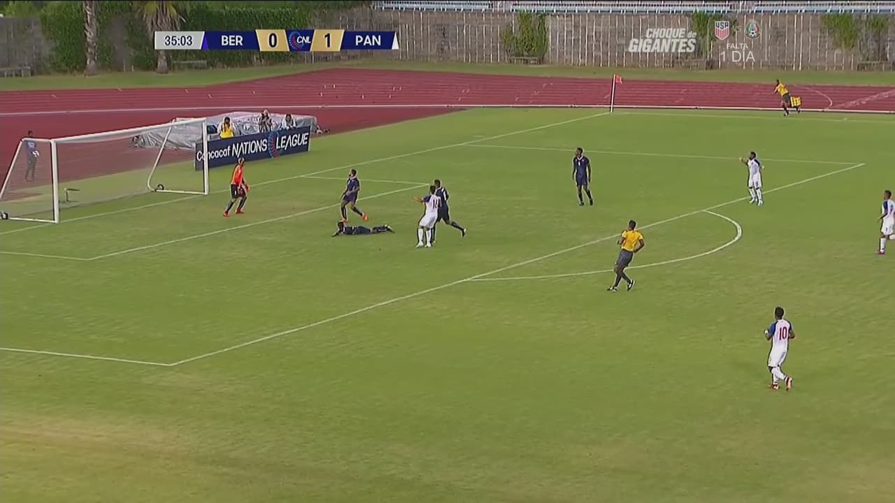 El atacante panameño quiere colgar el balón en el ángulo pero el poste le roba el tanto.