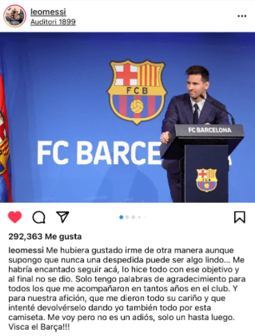 "Me hubiera gustado irme de otra manera aunque supongo que nunca una despedida puede ser algo lindo... Me habría encantado seguir acá, lo hice todo con ese objetivo y al final no se dio. Solo tengo palabras de agradecimiento para todos los que me acompañaron en tantos años en el club. Y para nuestra afición, que me dieron todo su cariño y que intenté devolvérselo dando yo también todo por esta camiseta. Me voy pero no es un adiós, solo un hasta luego. Visca el Barça!!!", reza el mensaje de Leo Messi en Instagram, acompañado con una fotografía de la rueda de prensa que dio este mismo domingo.