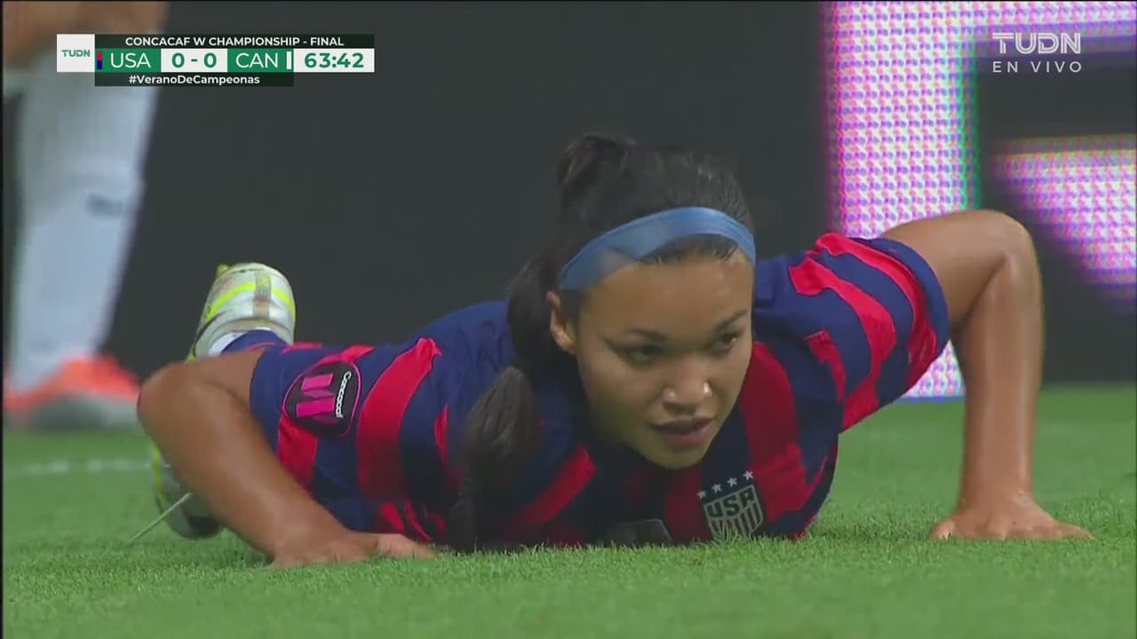Gran pase filtrado de Alex Morgan para Sophia, quien se quita a la portera, pero no puede hacer el gol al 64’.