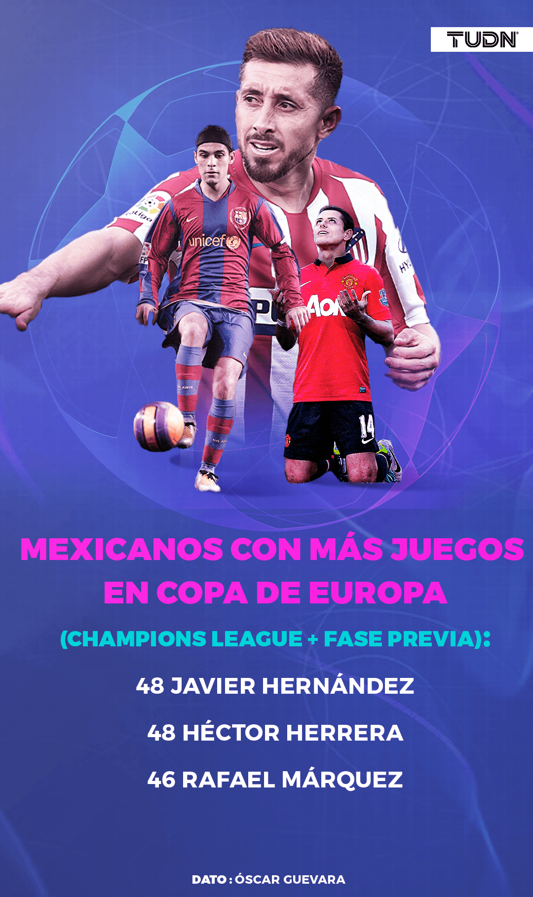Chicharito consiguió la marca entre cuatro de los cinco clubes en los que participó; Manchester United, Real Madrid y Bayer Leverkusen. Con el West Ham y Sevilla no jugó en competiciones de la UEFA.