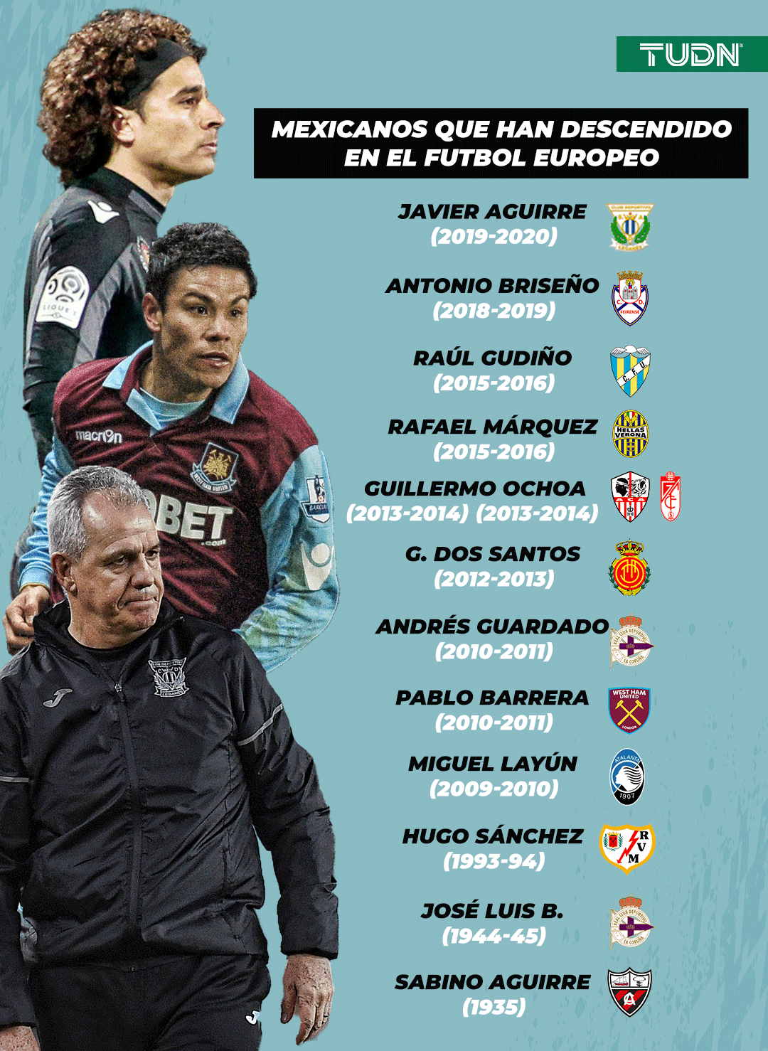La mitad de los 12 mexicanos que han descendido en el viejo continente lo han hecho en el futbol español. Incluso, dos de ellos lo hicieron con el mismo equipo, el Deportivo La Coruña, José Luis Borbolla en la temporada 1944-45 y Andrés Guardado en la 2010-11.