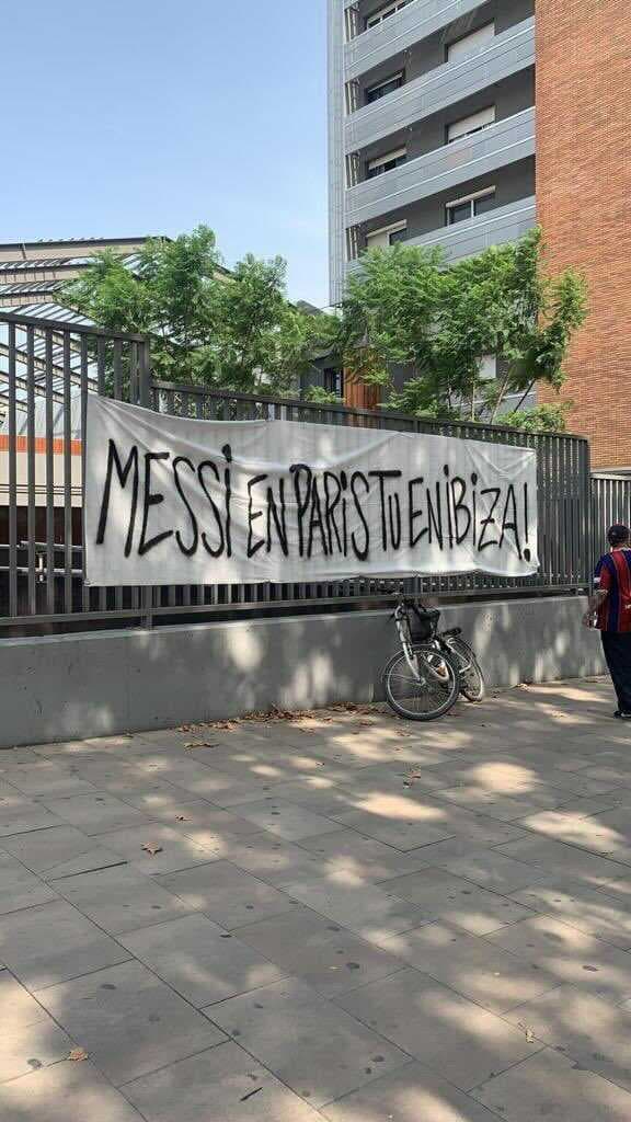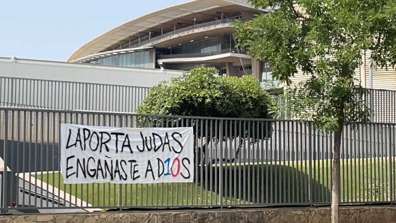 Aparecen mantas fuera del Camp Nou contra el presidente del Barcelona Joan Laporta, acusándolo de haber traicionado a Lionel Messi y ocasionando su partida al PSG en pro de otros intereses, incluso se le relaciona como un sirviente más de Florentino Pérez.