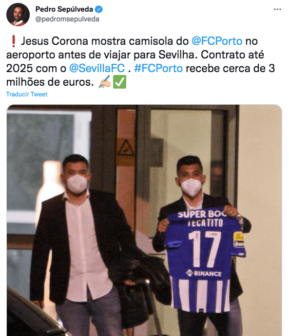 Jesús Manuel ‘Tecatito’ Corona viajó este jueves hacia Sevilla para cerrar su traspaso con el equipo andaluz, con el que de acuerdo a diversos medios en Portugal y España, el mexicano jugará tres temporadas y media en España.