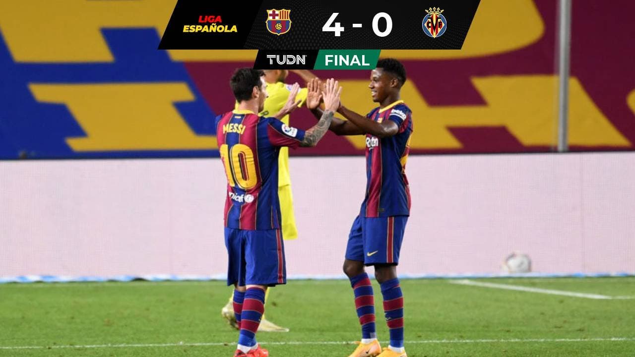 En el minuto 35, Lionel Messi transformó en gol un penalti cometido por Mario Gaspar sobre un Ansu Fati en estado de gracia y, en el 45, Pau Torres hizo el cuarto en propia portería al intentar evitar que Sergio Busquets rematara un centro de Messi.