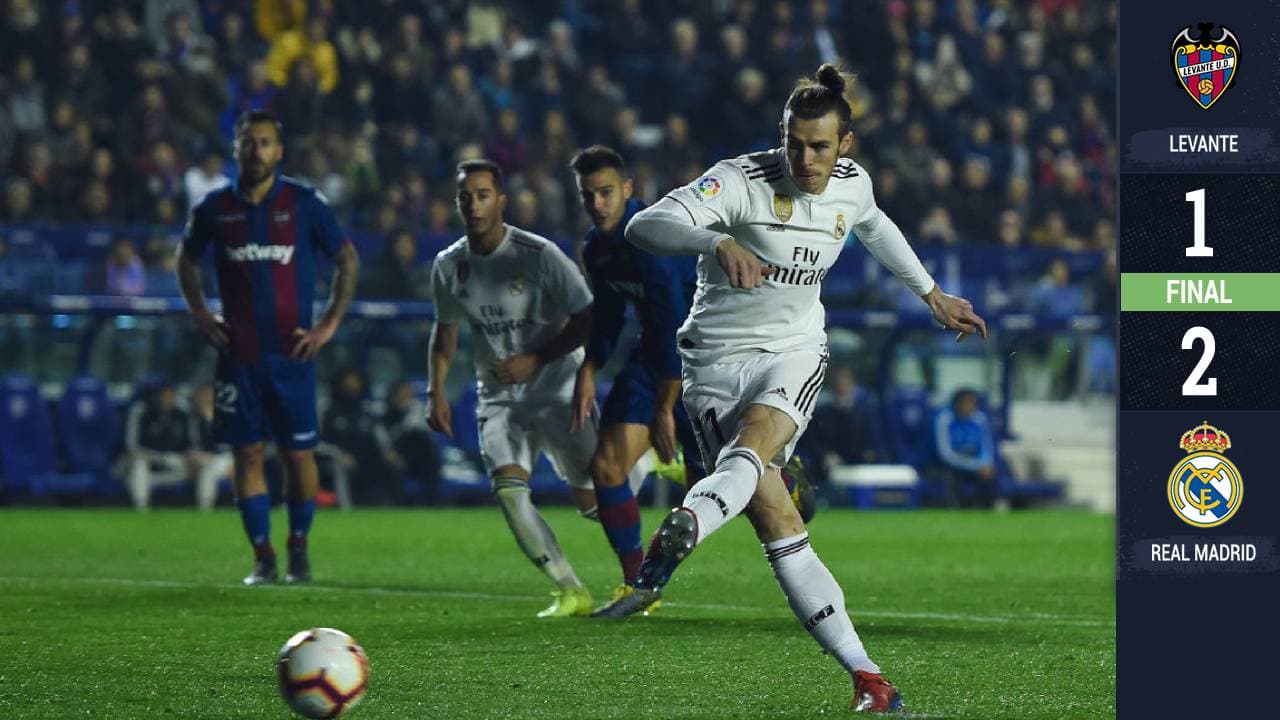 Los blancos, en un discreto partido y con dos goles de penal, superaron 2-1 al Levante y siguieron en el tercer lugar de La Liga de España, a nueve puntos del líder, el FC Barcelona.