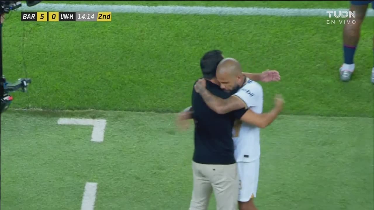 Al salir de cambio al minuto 60', el brasileño se fundió en un abrazo con el técnico del conjunto blaugrana Xavi Hernández y después fue a saludar a cada uno de los jugadores e integrantes del equipo que estaban en la banca. Alves salió el Spotify Camp Nou en medio de una gran afición de los seguidores del Barça.