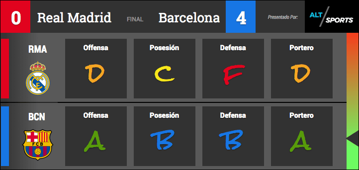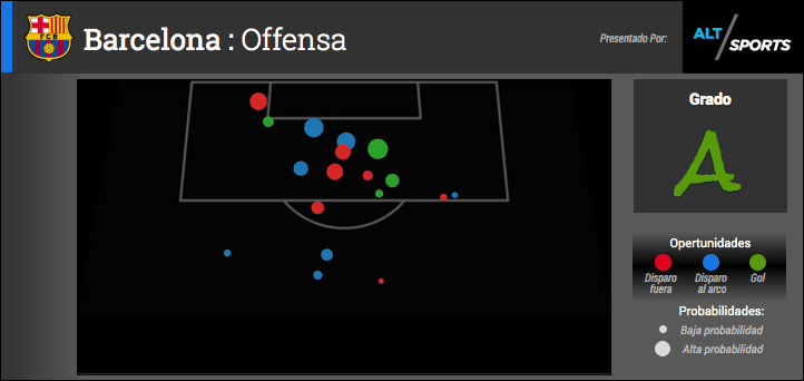 Al ataque del Barça creó siete grandes oportunidades resultando en 4 goles – los goles son ilustrados como los círculos verdes y el tamaño del círculo representa la calidad de la oportunidad como se muestra en la grafica inmediata superior: Suárez (11' y 74'), Neymar (39') e Iniesta (53'). La inclusión de Messi como suplente en el minuto 60 cuando ya tenia tres goles de ventaja sirvió come exhibición de lujo por parte del club catalán. En sus 33 minutos sobre el terreno de juego, Messi logró completar mas pases en el último tercio del campo (15/20) que cualquier otro jugador del Real Madrid, salvo a Luka Modric (18/22). En comparación, la ofensiva del Real Madrid creó una sola oportunidad de alta probabilidad por parte de Gareth Bale, y tuvo unas cuanta mas oportunidades que no pudieron superar al arquero Claudio Bravo.