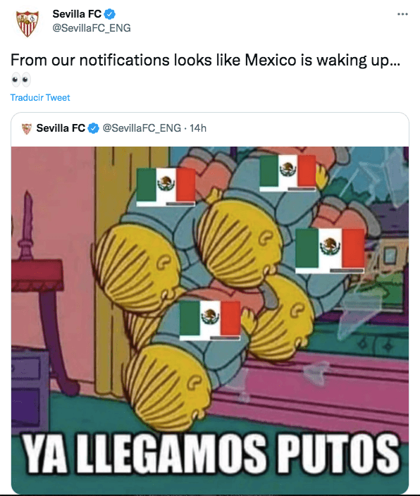 Con la frase "ya llegamos putos" y una peculiar imagen de Los Simpson, que forma parte ya de una tradición entre los aficionados mexicanos para apoyar a sus jugadores compatriotas en Europa, la cuenta del Sevilla buscó empatizar con los viejos y nuevos seguidores.