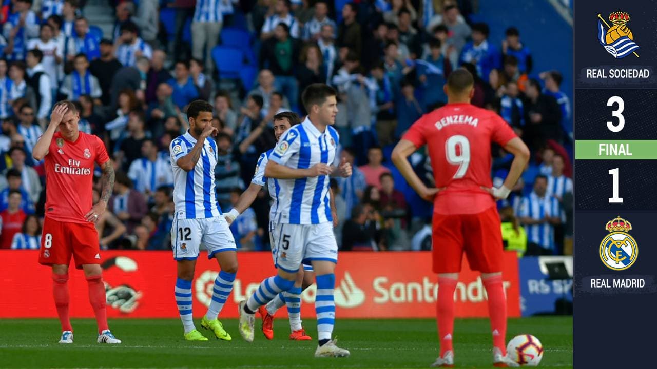 El Real Madrid arrojó ya la toalla, con uno menos y una Real con varias marchas más, intentó contener el chaparrón pero los donostiarras eran una máquina de fútbol y lograron el tercero en otra gran combinación de su ataque, Oyarzabal la remató al palo y el rechace posterior lo aprovechó Barrenetxea para batir a un Courtois que quizás pudo hacer algo más.