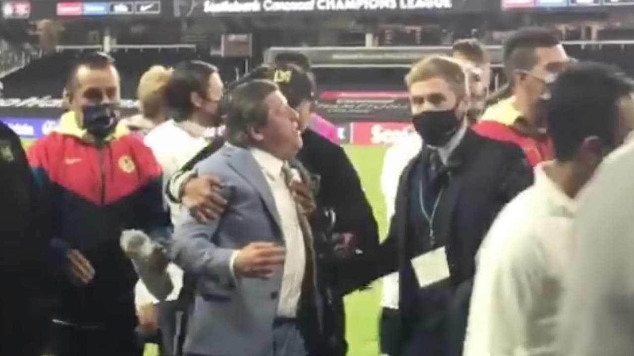 El primer tiempo entre LAFC y América terminó muy caliente y el DT de las Águilas se hizo de empujones y jaloneos con staff del cuadro angelino.