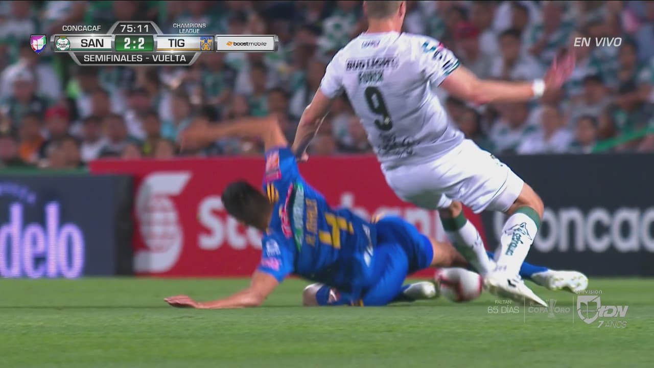 El defensa de Tigres se lastimó el brazo izquierdo que se le hizo palanca con el campo tras pelear una pelota con el atacante de Santos.