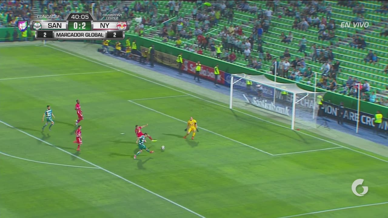 Diego Valdés robó una pelota en la salida del NY Red Bulls y le puso medio gol al delantero argentino de Santos Laguna que definió cruzado pero Luis Robles hizo un paradón.
