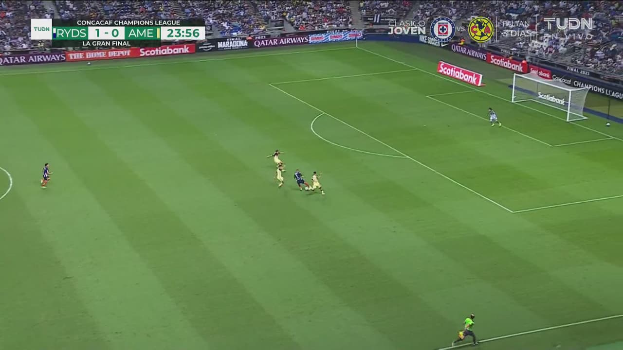 El delantero de Rayados recibe la pelota tras otro error en defensa y no puede disparar, al 24'.