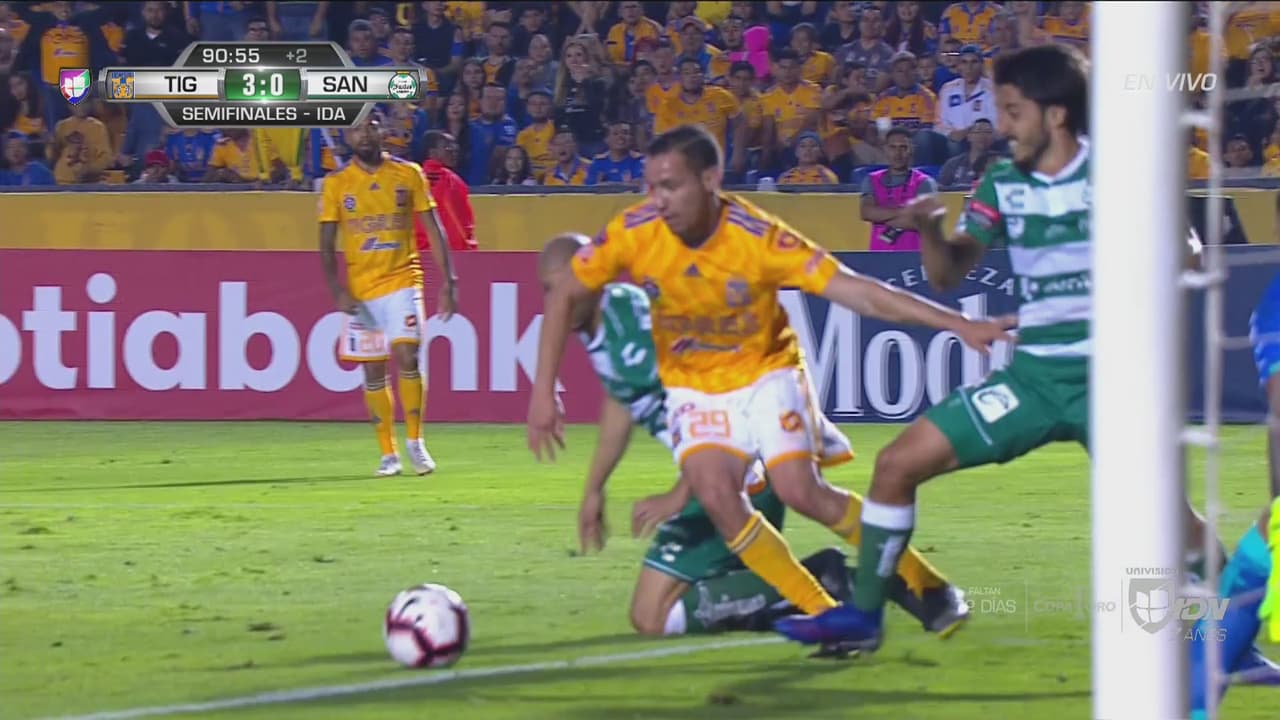 El mediocampista de Tigres remató de media vuelta pero el pie izquierdo del arquero de Santos tapó el balón en otra ocasión desperdiciada para meter el cuarto gol felino.