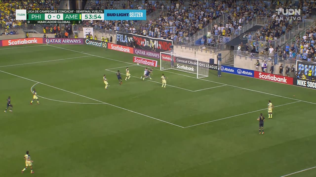 Bedoya metió centro por la derecha, Kacper llegó solo y sin marca, pero el portero del América atajó al 54’.