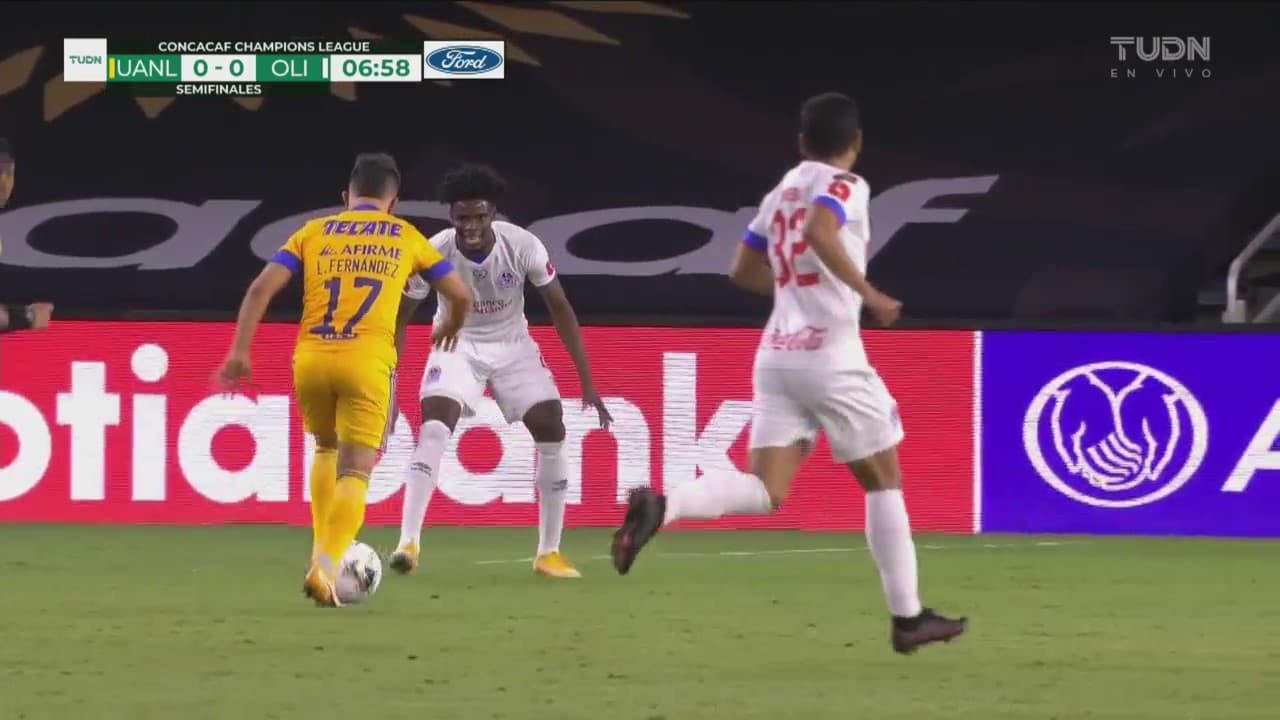 El jugador de Tigres trata de sorprender al guardameta, que le mete la mano para apagar el fuego.