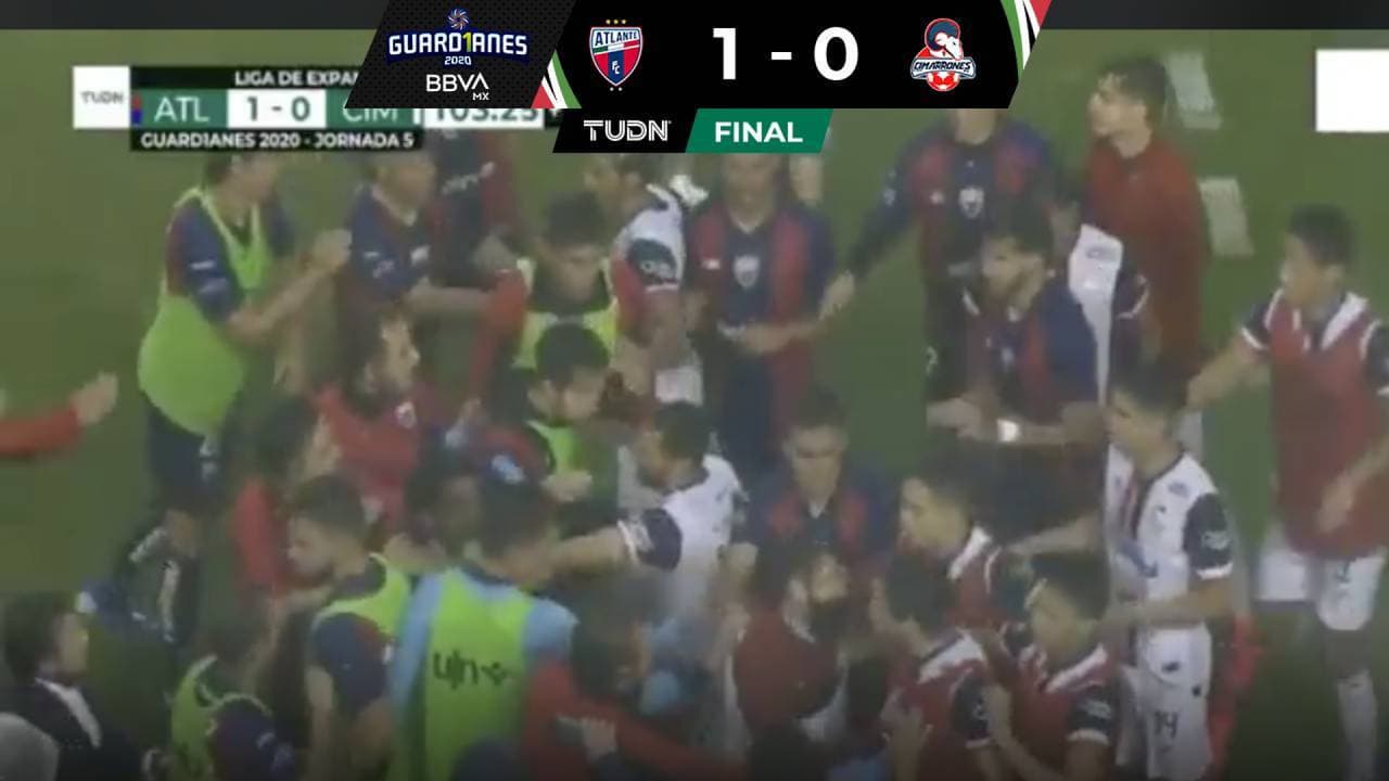 El arquero de Atlante tardó en despejar cuando ya se habían cumplido los 10 minutos de agregado, pero el jugador Machado, de Cimarrones, empujó al guardameta y sus compañeros se le fueron encima. Saavedra le dijo al árbitro que alguien de Potros de Hierro lo golpeó y todo se fue hasta las bancas, donde tuvieron que detener a Mario García, técnico azulgrana, porque se calentó de más.