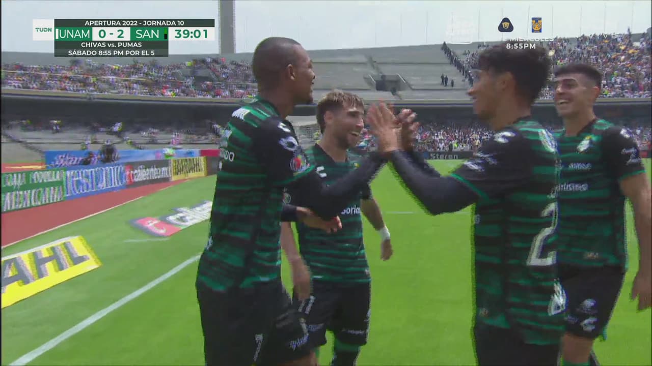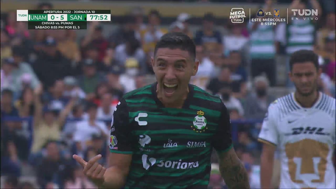 La goleada se hizo mayor cuando Santos volvió a hacer agua la defensiva universitaria, vino el disparo que rechazó Julio González, pero Leo Suárez cerró la pinza para poner la manita.