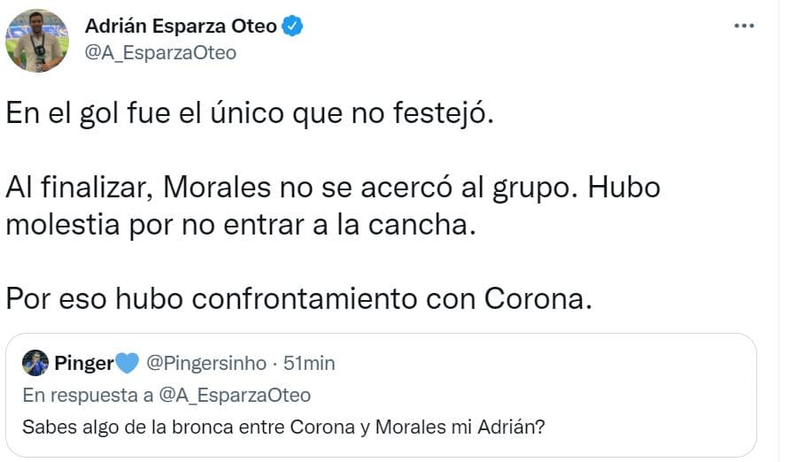 Ante esta situación, Morales y Corona tuvieron un confrontamiento, porque al parecer, el jugador de Chile no festejó el gol de Alonso Escoboza y expresó su molestia porno haber entrado a la cancha.