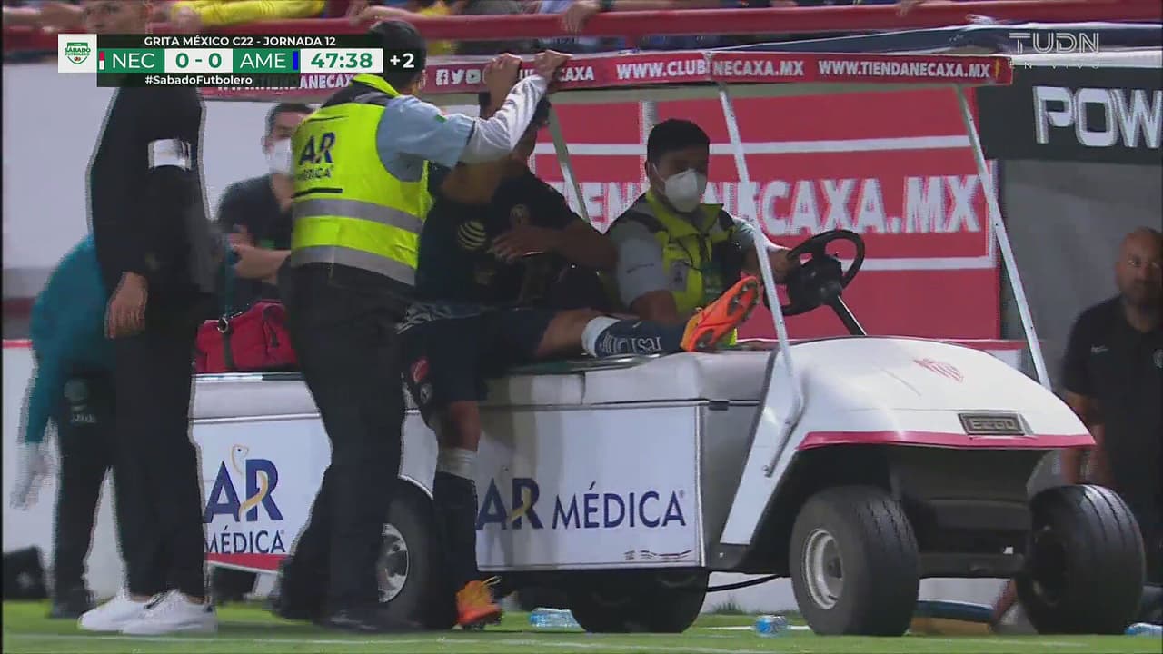 El defensor del América al tratar de parar la jugada se cuelga del atacante de Necaxa y le cae en el tobillo.