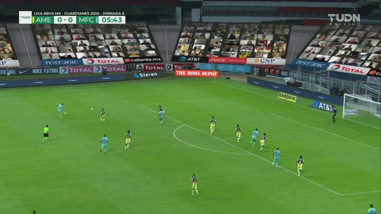 Asistencia exquisita de Jorge Sánchez que metió un gran pase al hueco, justo detrás de la defensa para que Henry Martín sacara un zapatazo cruzado y abriera el marcador con el considerado gol de vestidor en favor del América.