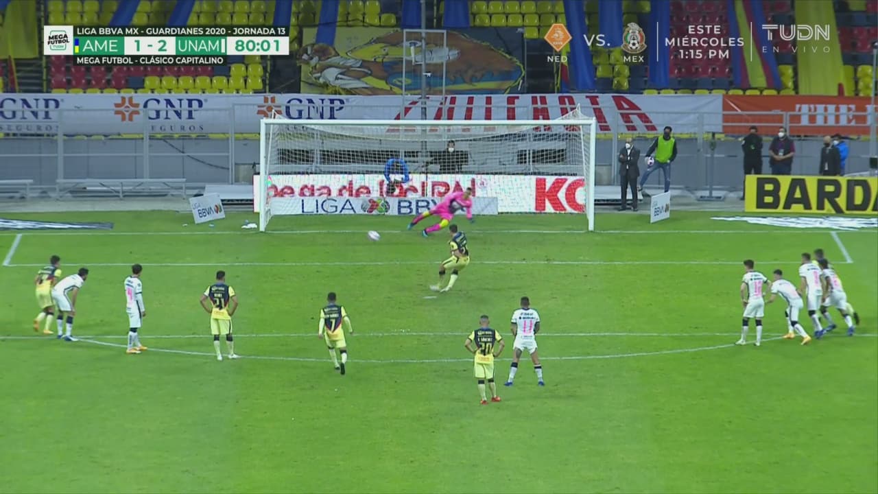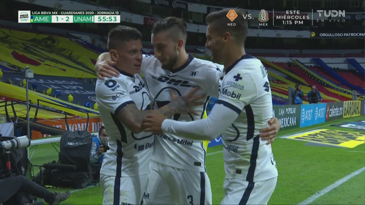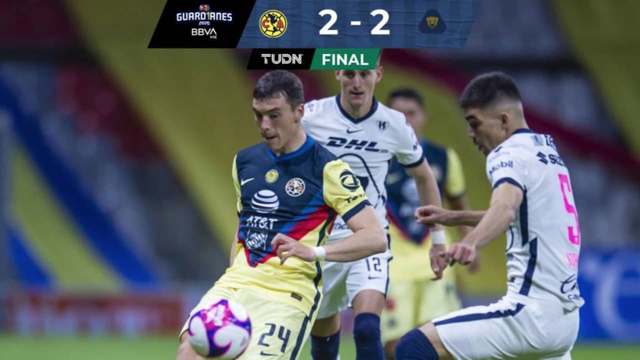 Las Águilas del América evitaron la derrota en casa frente a Pumas, tras empatar 2-2, en una seguidilla de tres clásicos en la que se mantuvo invicto, tras una victoria y dos empates; el partido correspondió a la Jornada 13 del Guard1anes 2020 BBVA MX.