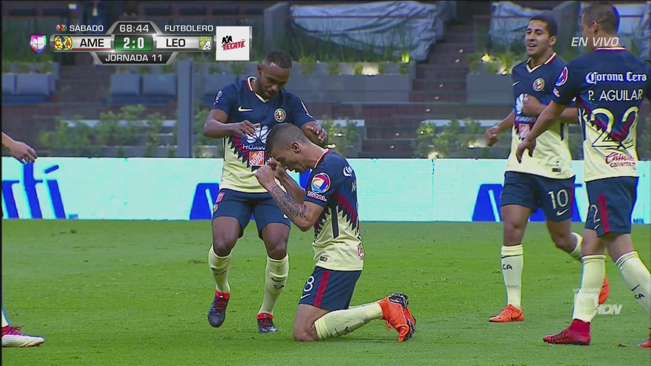 Mateus Uribe sacó un bombazo para meterla al ángulo superior izquierdo, para marcar el 2-0 de las Águilas sobre León e Iris gritó el tanto a todo pulmón.