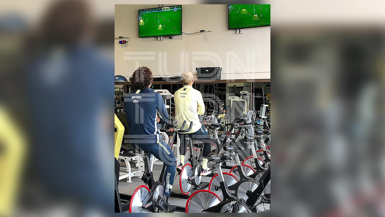 Desde el gimnasio del Nido, jugadores como Guillermo Ochoa y Guido Rodríguez observan el cotejo mientras tienen activación físcia en bicicleta. Y es que Rayados y Azulcremas se verán las caras los próximos jueves 26 de diciembre y el domingo 29 para el cotejo que definirá al campeón de la Liga MX.