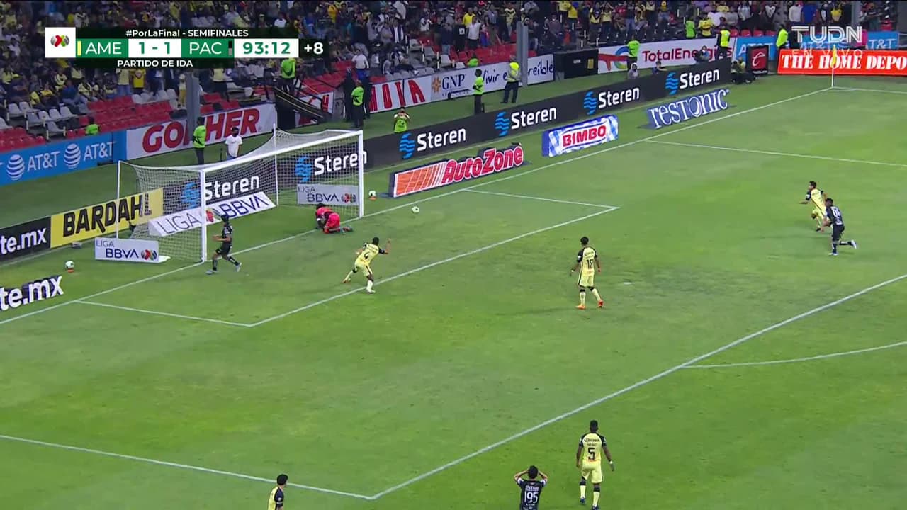 Tiro atajado Por arriba en el centro del arco. Nicolás Ibáñez (Pachuca) disparo de cabeza desde el centro del área. Asistencia de Daniel Aceves con un centro al área.