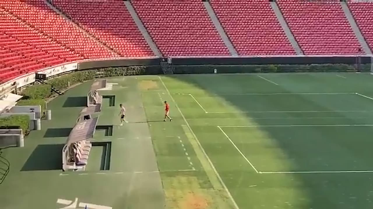 De acuerdo a Erick López, reportero de TUDN, el jugador apareció en la práctica, pero sigue recibiendo trabajos de rehabilitación.