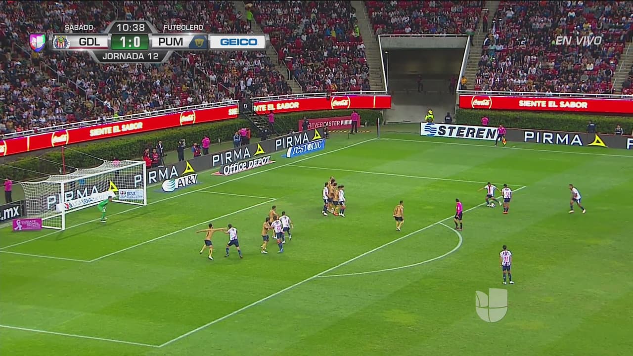 Gran cobro de tiro libre del lateral rojiblanco que cimbró la portería universitaria. Chivas muy cerca del segundo.