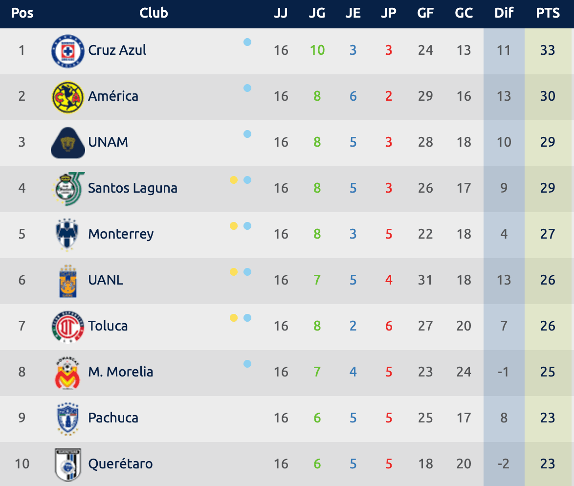 Actualmente ya son cinco equipos con boleto seguro para la ‘fiesta grande’ del balompié azteca: Cruz Azul, América, Pumas, Santos y Monterrey. Para la jornada 17 serán cinco equipos los que buscan tres sitios en la liguilla: Tigres, Toluca, Pachuca, Morelia y Querétaro. Además, las posiciones en la tabla variarán seguramente aunque, si la liguilla se jugara en este instante quedaría de la siguiente manera.
