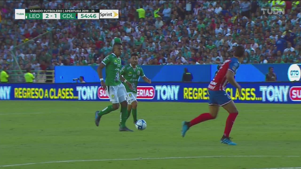 El colombiano sorprende con un potente derechazo a las afueras del área que obliga al arquero de las Chivas a estirarse al máximo y evitar la anotación.