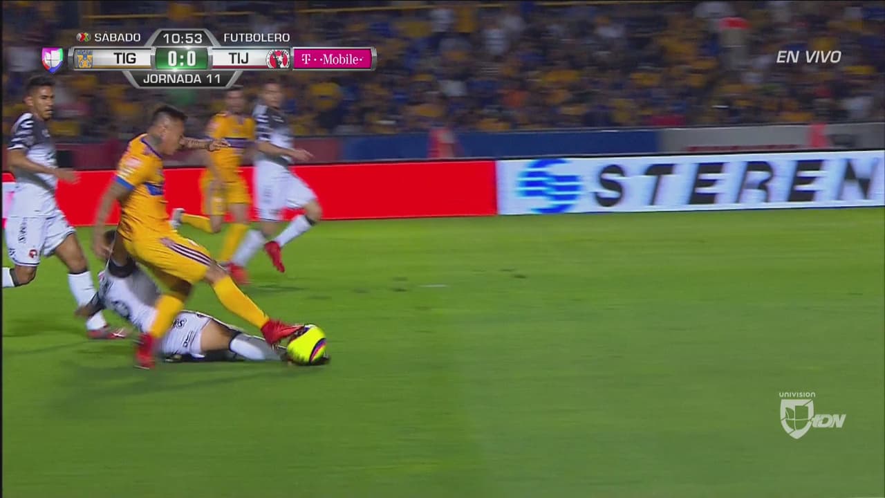 Gran barrida del zaguero de Xolos para evitar el disparo de Edu Vargas que bien pudo abrir el marcador en el ‘Volcán’.